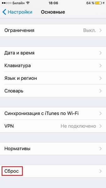 - На экране с настройками необходимо выбрать раздел «Основные». Потом осуществить переход на «Сброс» и нажать клавишу, на которой написано «Стереть контент и настройки».
